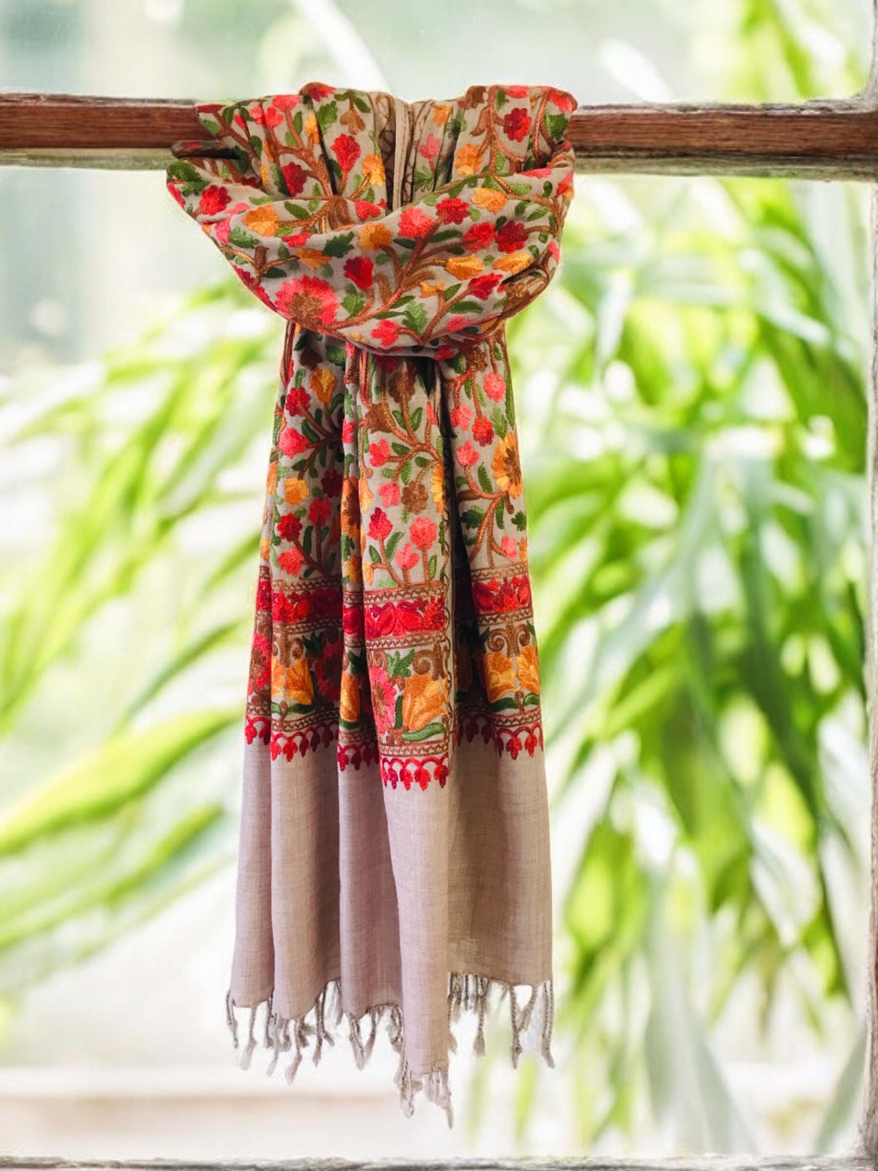 Écharpe/châle en 100% LAINE avec broderie multicolore.
